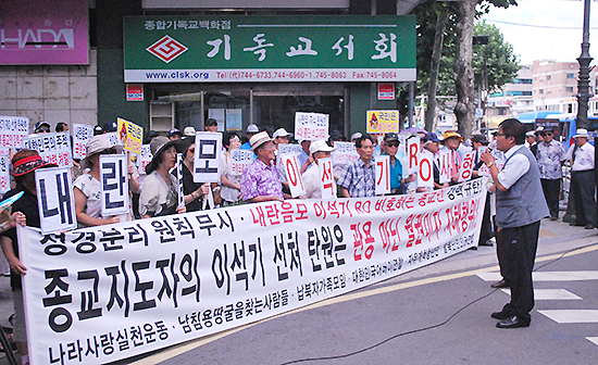 | ▲NCCK 김영주 총무가 종단 지도자들과 함께 이석기 선처 탄원서를 재판부에 제출한 데에 보수 단체들이 NCCK 사무실이 있는 기독교회관 건물 앞에서 김 총무를 비난하는 집회를 열고 있다. ⓒ사진=이인기 기자 |