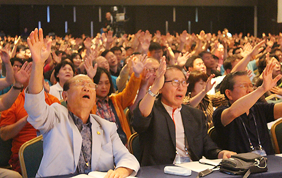 | ▲CBMC 제41차 한국대회에서 CBMC 전현직 임원들이 뜨겁게 기도하고 있다. ⓒ사진=공동취재단 |