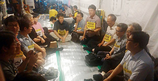 | ▲세월호 유족 농성장을 방문한 신학자들이 대화를 하고 있다. ⓒ사진제공=심광섭 교수 페이스북 |