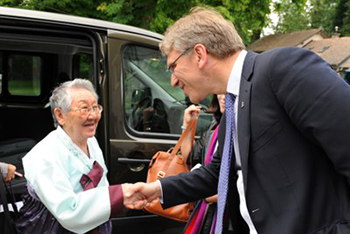 | ▲울라프 트베이트 WCC 총무가 일본군 성노예 생존자 길원옥 할머니를 맞이하고 있다. ⓒ사진제공=WCC |