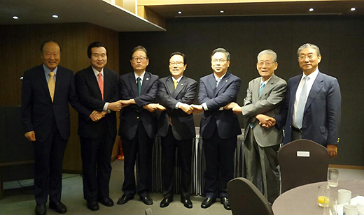 | ▲한기총 증경회장들과 손을 맞잡고 있는 여의도순복음교회 이영훈 목사(오른쪽 세번째). ⓒ사진제공=공동취재단 |