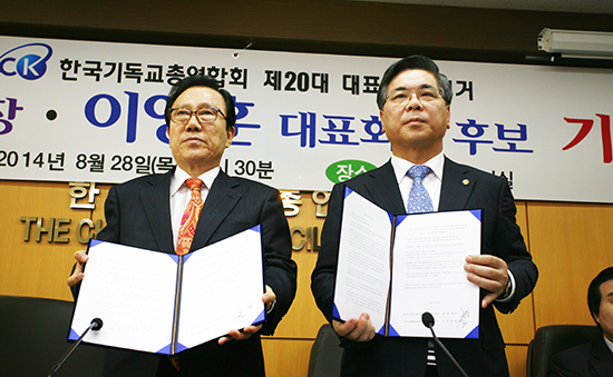 | ▲한기총 홍재철 전 대표회장과 한기총 새 대표회장 후보 이영훈 목사가 ‘보수신학’ 노선 계승의 내용을 담은 공동선언문을 들어보이고 있다. ⓒ사진=지유석 기자 |