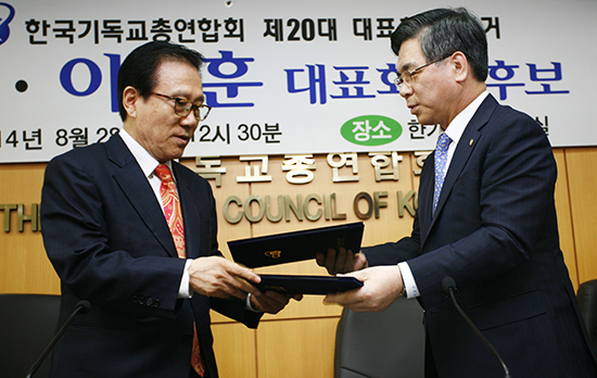 | ▲한기총 홍재철 전 대표회장과 한기총 새 대표회장 후보 이영훈 목사가 ‘보수신학’ 노선 계승의 내용을 담은 공동선언문을 교환하고 있다. ⓒ사진=지유석 기자 |