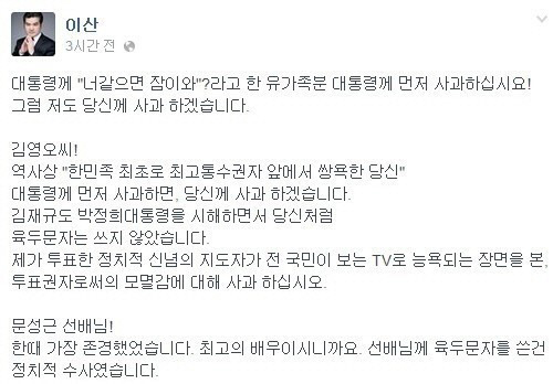 그는 여전히 자신의 잘못을 뉘우치지 못하는 모습이다. 그는 자신의 페이스북에 김영오 씨에게 먼저 사과를 요구했다. “제가 투표한 정치적 신념의 지도자가 전 국민이 보는 TV로 능욕되는 장면을 본 투표권자로서의 모멸감에 대해 사과하라”는 것이다. 아무리 좋게 보아도 그의 감정이입 능력은 반쪽짜리다. 이런 인성을 가진 배우는 아무짝에도 쓸모없다. 하루빨리 제대로 된 인성교육 기관에 위탁해 일그러진 심성부터 바로 잡아줘야 할 것 같다.