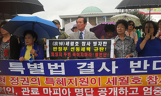 나라사랑어머니연합, 부정부패추방시민연합, 구국채널, 활빈단, 자유연합 등 보수단체들이 9월3일(수) 여의도 국회의사당 앞에서 세월호 특별법 반대 기자회견을 열었다. 특히, 활빈단 홍정식 대표는 국회 정문에서 세월호 특별법 지지 1인시위자에 맞서 “민생외면에 싸늘히 등돌린 민심, 정치싸움 즉각 중단! 민생법안처리!” “(애도) 세월호 참사빙자한 반정부 선동세력 규탄! 희생자 두 번 죽이지 마라!” 등의 구호를 내걸며 반정부세력 규탄 시위를 벌였다.