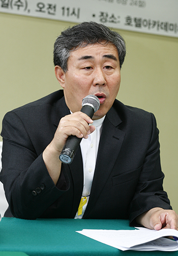 | ▲기장 총회 총무 배태진 목사가 기자간담회 중 기자들의 질의에 답변하고 있다. ⓒ사진=지유석 기자 |