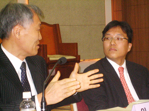 | 한신대 임석민 교수가 강주엽 과장이 발제한 4대강 살리기 사업에 대해 논박하고 있다. ⓒ박종배 기자 |