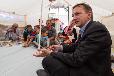 | ▲이슬람국(IS)에 의해 추방된 주민들이 이라크 에르빌 시 갈대아 교회 마당에 세워진 텐트에서 생활하고 있는 가운데 WCC 국제문제관련교회위원회 피터 브루브 이사가 모술 지역으로부터 추방된 기독교인 가정과 폭력사태에 대한 대화를 나누고 있다. ⓒ사진제공=Gregg Brekke/ WCC |