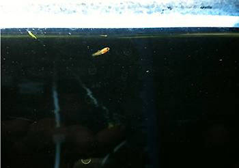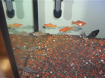 | ▲민물고기들과 잘 놀고 있는 쏘드테일 3마리, 수컷 2마리와 배가 부른 오른쪽 암컷 한 마리. ⓒ사진=이충범 교수 |