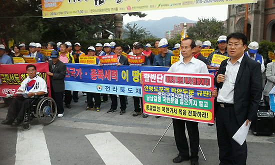 시민단체 활빈단, 재향경우회전북지부, 대한민국수호천주교인모임 등은 9월15일(월) 오후 천주교정의구현사제단 전주교구가 집전한 세월호특별법 제정 시국미사에 반대하는 기자회견을 전주시 풍남문 앞에서 열고 반정부 선동세력 추방을 외쳤다.