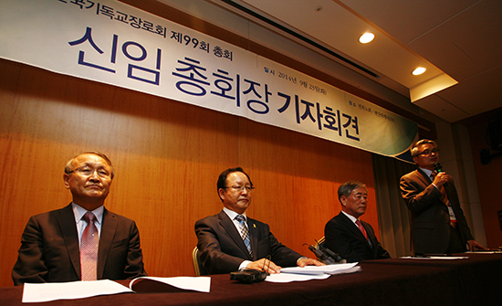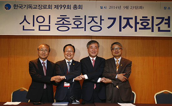 | ▲기장 제99회 총회 새 임원들이 기자회견이 참여하고 있다. ⓒ사진=지유석 기자 |