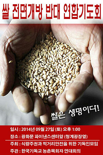 <쌀 개방반대 기독교연대>는 9월27일(토) 오후 1시에 광화문 감리교본부(동화면세점) 앞에서 “식량주권과 먹거리안전을 위한 쌀 전면개방 반대 연합 기도회”를 개최한다. 기도회는 조언정 목사(기감, 연대회의 의장)의 인도 아래 농촌목회자들이 주축이 되어 진행되며 말씀 선포와 결의문 낭독 등도 있을 예정이다.