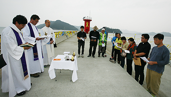 | ▲29일(월) 아침 성공회 순례단이 순례에 앞서 팽목항에서 파송 성찬례를 봉헌했다. ⓒ사진=지유석 기자 |