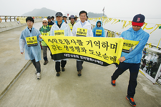 세월호 참사 특별법을 둘러싸고 이념대립 양상이 불거지는 가운데 대한성공회 정의평화사제단(회장 장기용 신부, 이하 사제단)은 9월29일(월) <세월호 참사를 기억하며 걷는 생명평화 도보순례>(이하 순례)를 시작했다. 이번 순례는 진도 팽목항을 출발해 서울 광화문 광장까지 총 557km를 걷는 여정이다. 순례 첫날엔 사제단 소속 사제와 일반 참가자 등 총 15명이 참여했다.
