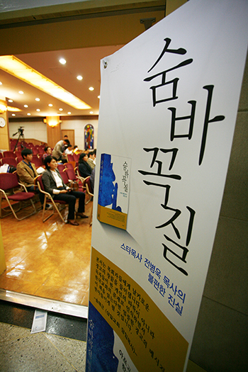 전병욱 전 삼일교회 담임목사의 성범죄와 회개 없는 교회개척을 고발한 『숨바꼭질』 이 출간된 가운데 6일(월) 오후 서울 종로구 연지동 한국기독교회관에서는 출간 기념 포럼 <전병욱 목사는 ‘무엇’에 숨어 있나?>가 열렸다. 포럼이 열리는 현장에서는 『숨바꼭질』 편집팀이 참석자들에게 도서를 정가에서 할인된 가격으로 판매했다.