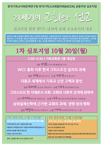 이 심포지엄에서는 WCC 제10차 총회에서 나온 주요문서의 내용과 그 시대적 의미를 설교 및 여러 교회교육에 활용할 수 있도록 연구한 결과가 발표된다. 기사연은 향후 2차례의 심포지엄을 더 개최하여 그동안 15인의 학자들이 연구한 결과를 연속적으로 발표할 예정이며 이번은 제1차에 해당한다.