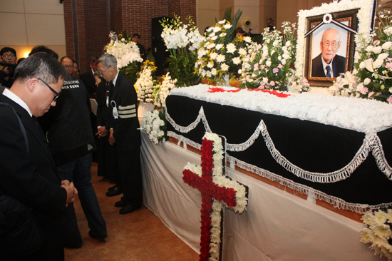 | ▲장례식에서 참석자들이 고 방지일 목사 영정 앞에 헌화한 뒤 기도하고 있다. ⓒ사진=지유석 기자 |