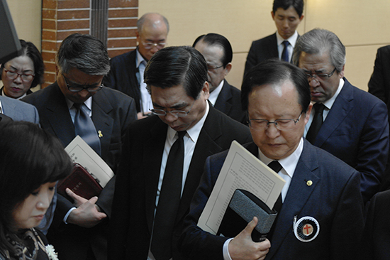 | ▲14일 오전 9시 고 방지일 목사 한국기독교회장이 한국교회백주년기념관 대강당에서 엄수됐다. 장례예배 기도하고 있는 교계 지도자들. 앞줄 오른쪽부터 왼쪽으로 황용대 목사(기장 총회장), 이영훈 목사(한기총 대표회장), 배태진 목사(기장 총무). ⓒ사진=지유석 기자 |