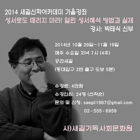 새길기독사회문화원(원장 정경일 박사)은 오는 10월29일(수) <새길신학아카데미> 8기 가을강좌를 개설한다. “성서로도 때리지 마라! 열린 성서해석의 방법과 실제”란 주제로 열리는 이번 강좌는 11월19일(수)까지 총 네 차례에 걸쳐 진행되며 대한성공회 박태식 신부가 강사로 나선다.