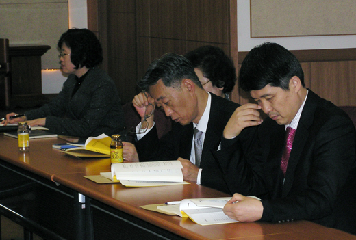 | ▲ 23일 오전 기독교회관 강당에서 열린 한국기독교가정생활협회 제54회 정기총회에 참석한 NCCK 권오성 총무(가운데)가 관련 자료집을 꼼꼼히 살펴보고 있다 ⓒ김진한 기자 |