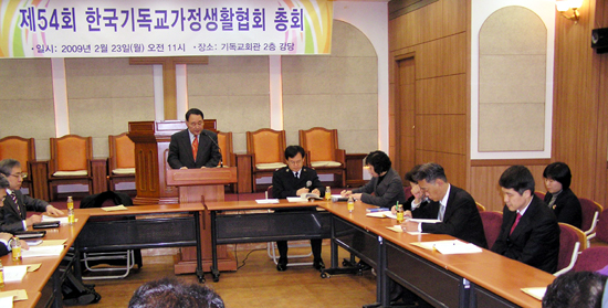 한국기독교가정생활협회(회장 전용철 목사)가 23일 기독교회관 2층 강당에서 제54회 정기총회를 열었다. 총회에서는 새 총무선출과 2008년 사업보고, 2009년 사업계획 발표 등이 이어졌다.