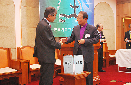 | ▲NCCK 김영주 총무에 대한 후보제청을 묻는 찬반투표에서 NCCK 회원교단들의 총무들이 투표위원으로 임명되어 투표과정을 안내하고 있다. 기장 배태진 총무(좌)와 기감 전용재 감독회장(우)이 투표 후 인사하고 있다. ⓒ사진=이인기 기자 |