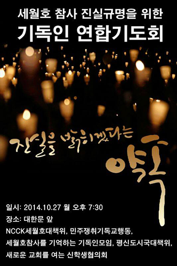 세월호 참사가 발생한지 오는 11월1일(토)로 꼭 200일을 맞이하는 가운데 기독교 시민단체는 10월27일(월) 서울 덕수궁 대한문 앞에서 “진실을 밝히는 약속”이라는 주제로 연합기도회를 연다. 이번 연합기도회엔 <한국기독교협의회(NCCK) 세월호대책위원회>, <민주쟁취기독교행동>, <세월호 참사를 기억하는 기독인 모임>, <평신도시국대책위원회>, <새로운 교회를 여는 신학생협의회> 등이 참여한다.