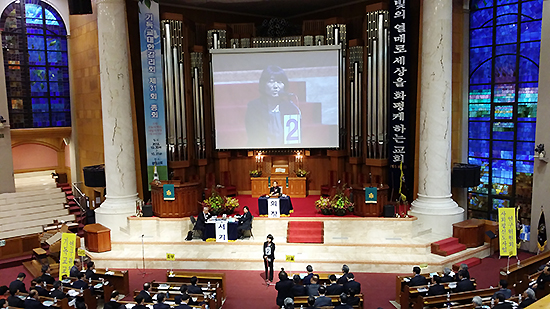 | ▲이날 총회에서는 세월호 참사로 딸을 잃은 박은희 전도사가 단상에 올라 "참사 원인 규명 등을 위해 감리회가 힘을 모아줄 것"을 요청하기도 했다. ⓒ사진=이인기 기자 |