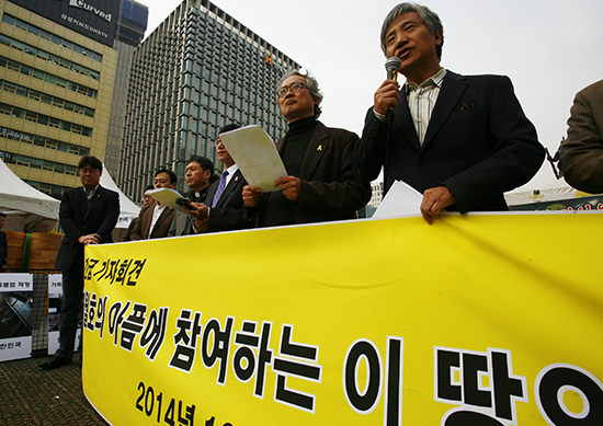 | ▲‘세월호의 아픔에 참여하는 이 땅의 신학자들’의 긴급 기자회견이 30일 오후 2시 서울 광화문광장에서 열렸다. ⓒ사진=지유석 기자 |