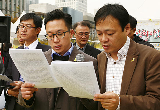| ▲박재형 한신대 교수(좌)와 신익상 성공회대 교수가 호소문을 낭독하고 있다. ⓒ사진=지유석 기자 |