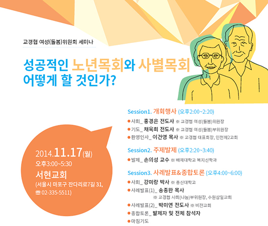 사단법인 교회갱신협의회(교갱협) 산하 여성(돌봄)위원회(위원장 홍경은 전도사, 이하 여성위원회)는 오는 11월17일(월) 오후 서울 마포구 서현교회에서 <성공적인 노년목회와 사별목회, 어떻게 할 것인가?>를 주제로 세미나를 개최한다.