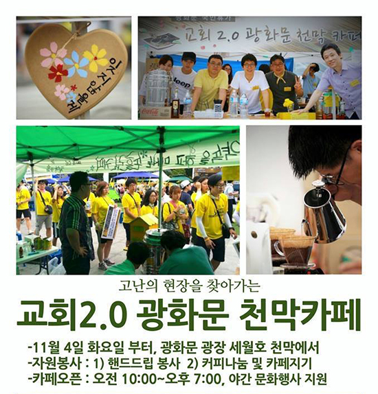 여야 정치권이 지난 10월31일(금) 세월호 특별법에 관한 합의안(이하 10.31합의안)을 발표한 가운데 건강한 작은교회를 지향하는 목회자 모임인 <교회2.0목회자운동>(이하 목회자운동)은 11월4일(화)부터 <고난의 현장을 찾아가는 교회2.0 광화문 천막카페>(이하 천막카페)를 다시 열었다. 목회자운동의 천막카페 운영은 지난 8월에 이어 두 번째다.