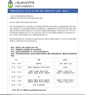 기독교환경연대 부설 한국교회환경연구소(소장 전현식 교수)는 11월14일(금) 오후 2시 연세대 신과대 4층 교수회의실에서 정책세미나를 개최한다. 주제는 “세월호 참사와 지구적 위기에 대한 생태신학적 성찰”이며, 세월호참사와 기후붕괴 등의 전 지구적 위기 사태의 원인을 고찰하고 이 상황에서 그리스도인들이 해야 할 일을 모색하는 시간을 갖는다.