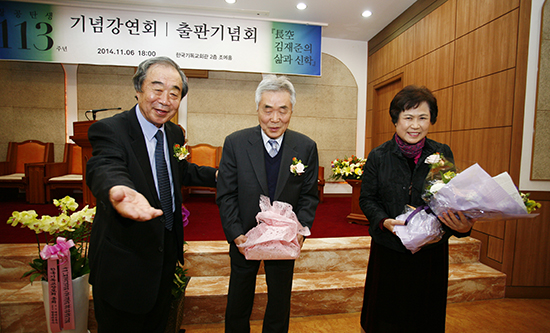 | ▲6일 오후 서울 연지동 기독교회관에서 열린 『장공 김재준의 삶과 신학』 출판기념회 및 기념강연회에서 사단법인 <장공 김재준 목사 기념 사업회>의 김경재 이사장(맨 왼쪽)이 장공의 유족인 김관용(가운데), 이정희 장로(맨 오른쪽)에게 책과 꽃다발을 증정하는 순서를 가졌다. ⓒ사진=지유석 기자 |