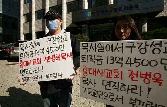 전병욱 전 삼일교회 담임목사의 면직을 다룰 예장합동 평양노회(노회장 강재식 목사, 이하 노회) 재판국이 11월10일(월) 오전 서울 대치동 노회 사무실에서 열린 가운데 전 목사가 출석했다. 전 목사 외에도 황 모 부목사, 허 모 장로를 비롯해 홍대새교회 쪽에선 성도와 부교역자를 합해 20여 명이 노회 사무실로 왔다. 그러나 전 목사는 취재진들에겐 모습을 드러내지 않았다.