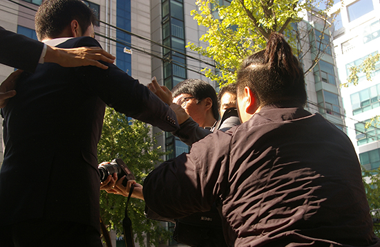 | ▲지난 2012년 10월 온라인카페 <전병욱 목사 진실을 공개합니다>가 ‘전병욱 저서 반납 행사’를 진행한 가운데 새교회 쪽 성도와 부교역자들이 현장을 취재하던 모 매체 기자의 취재장비를 탈취했다. ⓒ사진=지유석 기자 |