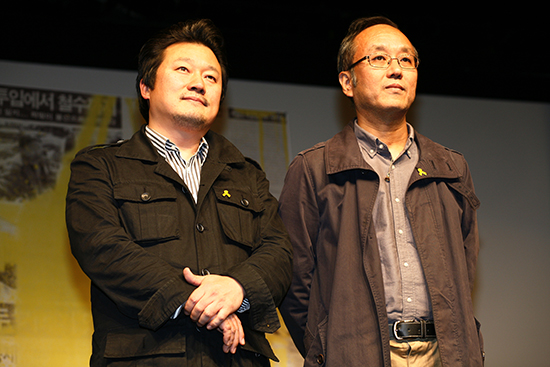 | ▲지난 10월 17일 있었던 <다이빙벨> 시사회에서의 이상호 기자(좌)와 안해룡 감독(우). ⓒ베리타스 DB |