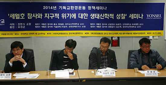 세월호 참사를 계기로 위기사회 담론이 사회적 의제로 부상한 가운데 한국교회환경연구소(소장 전현식)는 11월14일(금) 오후 서울 신촌 연세대학교 신과대학에서 <세월호 참사와 지구적 위기에 대한 생태신학적 성찰>이라는 주제로 ‘2014 기독교 환경운동 정책세미나’(이하 정책세미나)를 열었다. 이번 정책세미나에서는 세월호 참사에 국한되지 않고 기후 붕괴 등 전 지구적 위기의 원인에 대한 진단도 시도됐다.