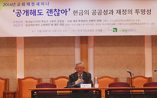 교회재정건강성운동(실행위원장 최호윤 회계사)은 11월14일(금) 오후 한국기독교회관 2층 조에홀에서 2014년 교회재정세미나 “공개해도 괜찮아: 헌금의 공공성과 재정의 투명성”을 개최했다. 이 날 ‘공공재로서의 교회재정’에 대한 좌담이 있기 전에 이형기 장신대 명예교수가 “하나님 나라의 복음과 교회의 공공성: 교회 재정 투명성의 신학적 전제”에 대해 강연했다.