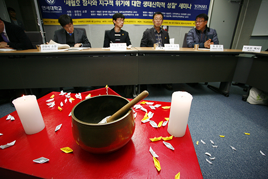 11월14일(금) 연세대학교 신과대학에서 <세월호 참사와 지구적 위기에 대한 생태신학적 성찰>이라는 주제로 ‘2014 기독교 환경운동 정책세미나’가 열린 가운데 세월호 참사 희생자를 기리는 조형물 <좌종, 종이배 416개>가 현장에 설치됐다.
