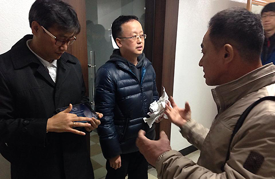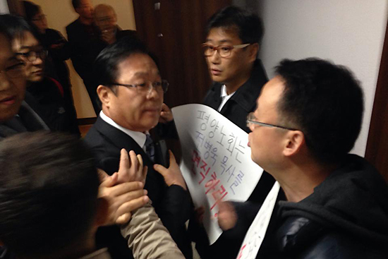 | ▲전병욱 목사 면직재판이 열리는 노회 사무실 앞에서 이진오 더함공동체 담임목사와 홍대새교회측 성도들이 대립하고 있다. ⓒ사진=지유석 기자 |