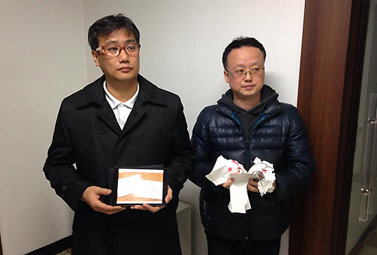 | ▲전병욱 목사 면직재판이 열리는 노회 사무실 앞에서 시위 중인 이진오 목사와 권대원 씨. ⓒ사진=지유석 기자 |