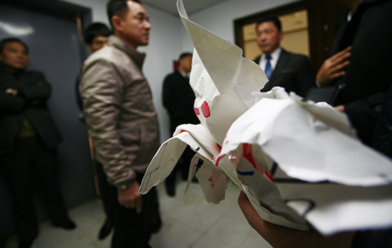 | ▲전 목사 면직재판 제3차 모임이 있던 예장합동 평양노회 사무실에서는 더함공동체 이진오 목사와 『숨바꼭질』 편집자인 권대원 씨가 게릴라 시위를 했다. 이러자 새교회 측 성도들은 두 사람의 피켓을 찢어버리는 등 자극을 했다. ⓒ사진=지유석 기자 |