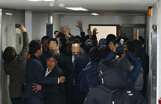 | ▲전 목사가 재판국 모임에 출석하기 전 새교회 성도들이 인의장막을 치고 취재진들의 접근을 봉쇄했다. ⓒ사진=지유석 기자 |
