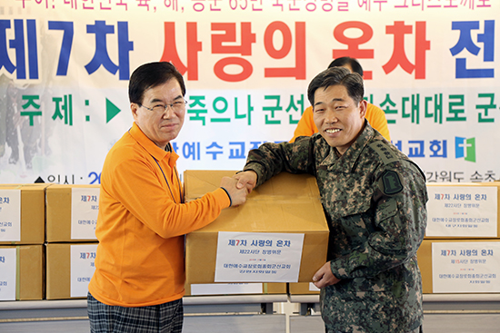 | ▲예장합동 총회군선교회(회장 김기원 목사)가 지난 18일 오후 전방 GOP부대 3개 사단 장병들에게 ‘사랑의 온차’ 40세트를 전달했다. ⓒ사진제공=예장합동 총회군선교회 |