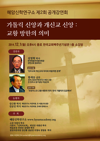 혜암신학연구소(소장 이장식 박사)는 오는 12월1일(월) 오후 종로 한국교회백주년기념관 1층 소강당에서 제2차 공개강연회를 개최한다. 이번 공개강연회는 “가톨릭 신앙과 개신교 신앙: 교황 방한의 의미”를 주제로 진행되며 프란치스코 교황 방한의 의미를 개신교와 가톨릭이 함께 되짚어 보는 자리다.