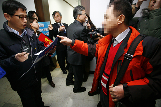 | ▲12월8일(월) 예장합동 평양노회 사무실에서 열린 전병욱 면직 재판에서 홍대새교회 측과 ‘전병욱 목사 성범죄 기독교 공동대책위원회’ 측 구교형 목사가 실랑이를 벌이고 있다. ⓒ사진=지유석 기자 |