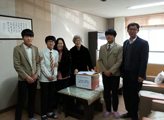 | ▲부천시 부인중학교(교장 김영철, 사진 오른쪽) 학생들이 북한아동을 위한 성금을 모아서 부천YWCA에 전달했다. ⓒ사진제공= 부천YWCA |