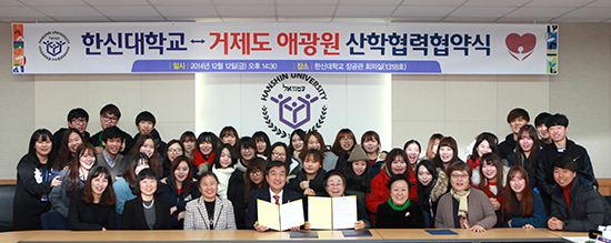 이날 협약식에는 한신대 채수일 총장과 심리·아동학부 강순원 학부장, 오현숙 교수, 유희정 교수, 재학생 50여 명과 거제도 애광원 김임순 원장, 송우정 이사, 김소영 민들레집 원장, 배종수 법인국장 등이 참석했다.