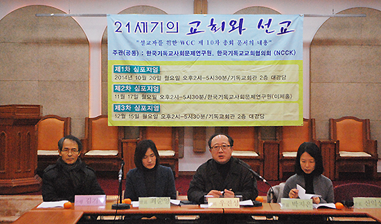 한국기독교사회문제연구원(원장 성해용)과 한국기독교교회협의회(총무 김영주)는 12월15일(월) 오후 ‘설교자를 위한 WCC 제10차 총회 주요문서의 내용’ 관련 심포지엄 <21세기의 교회와 선교>의 세 번째 모임을 기독교회관 조에홀에서 가졌다. 이 날 성공회대 신학연구원의 신익상 박사는 “우리의 살림을 생명살림으로 이끄시는 하나님”을, 이화여대 최순양 박사는 “WCC와 양성평등의 문제”를, 이화여대 박지은 박사는 “저항과 치유의 생태정의”를, 감신대 이은경 박사는 “기독교 선교의 핵심으로서의 에큐메니칼 신학교육의 중요성에 대한 고찰 및 한국교회교육에 대한 반성과 제언”을, 성공회대 김희헌 박사는 “한국교회의 선교과제로서의 평화통일”을 발제했다.